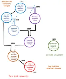 Graphic Outline of past New York City's five Veterinary Colleges (1857–1921) and of New York State Veterinary College of Cornell University (1894–), from Donald F. Smith, modified[9]