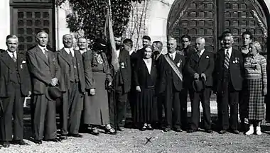 Cantacuzino was co-opted among the official Romanian representatives to the League of Nations (uninterruptedly, from 1929 to 1938), primarily as adviser on women and child protection.[78] Meanwhile, together with art historian Alexandru Tzigara-Samurcaș, she set up a Union of Intellectuals at a formal gala in 1926.[79] This circle was a local affiliate of Europe's Federation of Intellectual Unions, whose founders included Hugo von Hofmannsthal, Paul Valéry and Nicolae Titulescu, and whose stated mission was finding a solution to "the vital crisis of the continent".[80] One of its members was journalist Constantin Beldie, who left sarcastic notes about the Union's cultural conservatism.[81] Received and celebrated in Prague by Methodius Zavoral, Abbot of Strahov Monastery (1928), Cantacuzino was also a delegate to the Federation of Intellectual Unions Congress in Barcelona (October 1929).[82]
