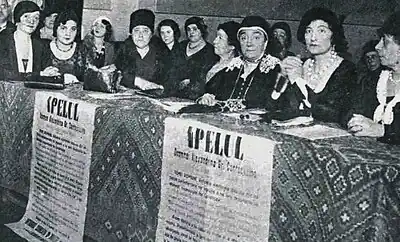 The central core of SONFR was a group of high-society ladies, including Alexandrina Cantacuzino and, among others, Zoe Râmniceanu, Elena Odobescu, Anastasia Filipescu, Maria Glagoveanu, Sultana Miclescu and Zetta Manu.[17] As indicated by the name, SONFR was situated on the conservative right of Romanian feminism, where it "reinforced women's traditional roles as mothers and wives",[18] being entirely apolitical.[19] However, the Society was soon involved in a number of adjacent projects, such as disseminating propaganda among the Romanians of Transylvania, Bukovina, and other parts of Austria-Hungary, and circulating letters of protest against Magyarization.[20]