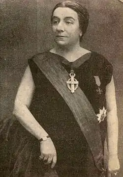 From 1925 to 1936, with a CNFR mandate, Cantacuzino served as Vice President of the International Council of Women (ICW), and, as such became Romania's best-known feminist.[66] She was one of the European delegates to ICW's 1925 Conference in Washington, D. C.[67] By 1926, her distinctions included the Grand Cross of Queen Marie, the Order of the Holy Sepulchre (Collar), the Order of St. Sava (Great Officer), the Croix de guerre (Officer) and the Croce al Merito di Guerra (Officer).[63] She was IWC delegate at the League of Nations in 1927, and again in 1933, as well as IAWSEC rapporteur to the same international body (1926, 1928, 1933).[62] Drifting apart from both the LDDF and AECPFR, who accused her of using feminism to advance her own "internationalist" goals, Cantacuzino presided upon Solidaritatea ("Solidarity"), her very own feminist sorority, enlisting it with IAWSEC as a separate body.[68]