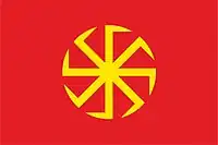 In the early 1990s, Dobroslav was the first to call the four-beam swastika "Kolovrat" and later transferred this name to the eight-beam rectangular swastika he introduced. According to the historian and religious scholar R. V. Shizhensky, Dobroslav took the idea of the swastika from the work of the Nazi ideologist Herman Wirth, the first leader of the Ahnenerbe.[12] Dobrovolsky introduced the eight-beam "kolovrat" as a symbol of "resurgent paganism."[13] Dobroslav declared the eight-beam "Kolovrat", supposedly a pagan sign of the Sun, consisting of two superimposed swastikas, the symbol of an uncompromising "national liberation struggle" against the "Zhyd yoke". According to Dobroslav, the meaning of "Kolovrat" entirely coincides with the meaning of the Nazi swastika. The eight-beam "kolovrat" accompanies many of Dobroslav's publications.[1]