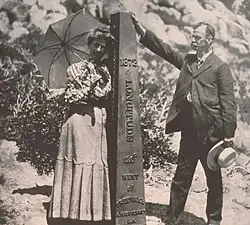 • This boundary monument, a cast iron column erected in 1873, marks the southern terminus of the California-Nevada State boundary established by A. W. Von Schmidt's 1872–73 survey. Von Schmidt's line, the first officially recognized oblique state line between California and Nevada, erred slightly, the boundary was later corrected to the present line, 3/4 mile to the north.[14]