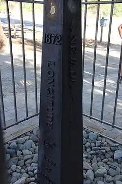 The Von Schmidt State Boundary Monument was designated a California Historic Landmark (No.859) on April 26, 1973. In 1873 San Francisco civil engineer Allexey W. Von Schmidt built the State Boundary Monument in San Bernardino County, California, near Needles, California.[1] In 1872 and 1873 Von Schmidt did a survey of the border between California and Nevada/Arizona. The California Historic marker is on the dirt road, Pew Road, also called River Road, 2.6 Miles South of the State Line; 14 Miles North of Needles. The marker is not at the current state boundary, as Von Schmidt made an error in his survey. A new survey in 1893 showed that the Von Schmidt line was 1,600 to 1,800 feet off to the west. The marker is at the southern end of the California-Arizona State boundary. In 1872, a dispute arose between Nevada and California about the location of the state's boundary. Nevada wanted the state divide to be the same as the Sierra Nevada mountain range divide. California wanted the line to the east of the mountain range. When California attained statehood in 1850, it adopted 120 degrees west longitude as its eastern border.[2][3] Between 1855 and 1900 there were six surveys to locate 120 degrees, with each locating 120 degrees of longitude differently.[4] Von Schmidt applied for and was granted the contract to survey the state's frontier border east of the Sierra Nevada. In 1872 Von Schmidt using only a compass, a sextant and dead reckoning process set out with his crew to define the boundary. Von Schmidt was charged to measure and mark the boundary. Von Schmidt and his crew built stone markers and installed cast iron markers about one mile apart on the length of the state's boundary. Not many of the markers had foundations, so fewer remain today.[4] A new survey in 1893 showed that the Von Schmidt line was 1,600 to 1,800 feet west of the actual 120 degrees. However, California and Nevada both recognize the 1872 Von Schmidt survey and the 1893 survey as the state line. Later the 1893 line was used.[4] The exact location of the north-south California-Nevada border, between Lake Tahoe and the intersection of the southern boundary of Oregon at the 42nd parallel, was contentious and was surveyed and re-surveyed many time.[5] [6] [7] One of the few iron markers that has survived is a near Verdi, Nevada, this is a National Historic Landmark called the 1872 California-Nevada State Boundary Marker.[8]