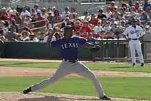 The Texas Rangers acquired Ogando in the rule 5 draft in December 2005 and converted him into a pitcher.[4] He earned an invitation to spring training in 2005; however, when he went to the U.S. embassy to pick up his work visa that January, consulate officials were waiting. They had noticed that an inordinate number of young minor league ballplayers had been married in a short period of time to women who had previously been denied visas, and it raised a red flag. Ogando immediately admitted guilt to his involvement in a human trafficking ring, and was assured that he would likely only receive a one-year exclusion, and that he would be able to reapply the following year. As it turned out, he was banned from entering the United States for five years, limiting him to winter ball, the Dominican Summer League and international tournaments.[5][6] Further efforts included sending Ogando to workouts in Japan, to see if any Nippon Professional Baseball teams were interested in his services.[7] Japanese interest in Ogando was not high, and he spent three seasons out of the DSL Rangers' bullpen, going 11–3 with a 1.11 earned run average and 114 strikeouts and holding batters to a .209 batting average. The Texas Rangers contacted the United States government, then led by former team owner George W. Bush, and Ogando was eventually pardoned, after speaking out on the dangers of human trafficking.[8]