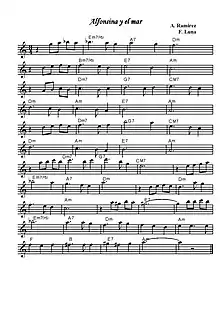"Alfonsina y el mar" (lit. 'Alfonsina and the sea') is a zamba composed by Argentine pianist Ariel Ramírez and written by Argentine writer Félix Luna. It was first released as part of Mercedes Sosa's 1969 album Mujeres argentinas. The song is a tribute to Argentine poet Alfonsina Storni, who committed suicide in 1938 by jumping into the sea from a jetty.[1][2] The song is a classic and has been interpreted by many artists of different nationalities.[3][4]