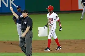 On March 20, 2006, Nationals manager Frank Robinson inserted Soriano in the lineup as the left fielder. Soriano, who since 2001 had played exclusively at second base, refused to take the field, and the Nationals organization threatened him with disqualification, which would have meant forfeiture of his salary, and he would not have received credit for service time in fulfillment of the obligations of his contract. With his contract's service terms officially still unfulfilled, he would then have been ineligible for free agency at season's end.[14] Two days later, Soriano relented and played in left field for the Nationals in their exhibition game against the St. Louis Cardinals. Robinson indicated that he considered Soriano's move to left field to be permanent and would not consider moving Soriano back to second base at any point during the season. In his comments following that game, Soriano indicated that he would accept his new position without further argument. As the season got underway, Soriano began to enjoy his new position, and by the All-Star break he led the league in outfield assists.[14] Soriano made his fifth consecutive All-Star team and became only the third man to start All-Star games for both leagues at two different positions.