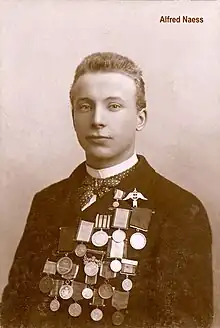 He was born on 26 April 1877 to Anne Jette Jensen (1847–?) of Kragerø or Skåtøy; and Kristian Andersen Næss (1848–?) of Grue, Norway. He was baptized as "Karl Alfred Ingvald Næss" on 27 May 1877 in the Garnison Menighet, in Oslo, Norway, but he always used the name "Alfred Næss". His father, Christian, was an army sergeant. Alfred had two siblings: Carl Albert Næss (1874–?); and Alvilde Marie Magdalene Næss (1875–1933) who married Thorvald Martin Tandberg (1874–1970).[5][6][7] Næss grew up in Vika.[8] On 6 February 1897 in Montreal, Quebec, Canada, he competed against Canadian Jack McCulloch in the 1,500-meter race, McCulloch and Næss tied, invoking a run-off. McCulloch won the run-off by two-fifths of a second.[9] Also on 6 February 1897 Næss equaled the world record of 46.8 seconds set by Wilhelm Mauseth on 3 February 1895 in Trondheim, Norway, but on 7 February 1897 the record was broken by Peder Østlund with a time of 46.6.[10] After Montreal he visited his sister in Portland, Maine, and gave a demonstration on 17 February 1897.[11]