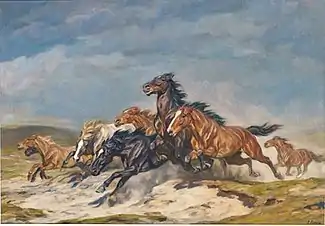 During the Nazi dictatorship, he was a member of the Reichskammer der bildenden Künste (Chamber of Fine Arts) and was able to continue working. From 1940 to 1944, he was represented at the Große Deutsche Kunstausstellung in the Haus der Kunst in Munich. For many years, his painting Flüchtende Pferde (Fleeing Horses), hung in Hitler's office at the Neue Reichskanzlei.[2] Alfred Rosenberg was an admirer of his painting, Fohlenzwillinge {Foal Twins)“.[3]