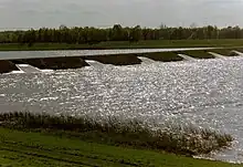 Immediately to the south, where the artificially constructed conduit of the river Hase flows into the Alfsee lakes, there is a small auxiliary basin (Absetzbecken) in front of the actual reservoir, from which water flows into the lake via a roughly 330 m long overflow dam.