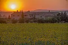 The Alhorines is one of the best cereal-growing areas in the province of Alicante.[1] The level of insolation in the area is among the highest in the Valencia region, at 1,900 kWh/m2 annually.[2] It is a relatively dry agricultural valley, but is of interest due to its unique layout. This includes small plots alternating between grain crops, vineyards and orchards, separated by fences and natural banks, with some sandy area colonized by pines. This makes it an appropriate habitat for numerous species of wildlife, especially small predators. The Bodegas Los Pinos winery in Fontanars dels Alforins, 635 metres (2,083 ft) above sea level, was founded at the end of the 19th century and in 1990 became the first organic winery in the Valencian Community and the second in Spain.[3]