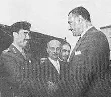 After Hussein returned to Amman, he continued to press for Abu Nuwar's return to Jordan, but Glubb consistently stalled efforts to reassign Abu Nuwar.[11] Later in 1953, Hussein sent Abu Nuwar to confer with the strongman of Egypt, Gamal Abdel Nasser, who had recently toppled his country's pro-British monarchy.[13] In 1954, Abu Nuwar was briefly brought to Amman for consultations with Hussein.[13] Hussein ultimately bypassed Glubb and had Abu Nuwar permanently reassigned to Jordan in November 1955.[3][13] Abu Nuwar arrived amid growing anti-British upheaval.[14] In a meeting between Glubb and Abu Nuwar, Glubb made clear his displeasure with Hussein's decision and threatened "shorten his [Abu Nuwar's] life" if he incited against British interests in the country.[13] After being informed of the meeting, Hussein appointed Abu Nuwar as his senior aide-de-camp (ADC).[11] Abu Nuwar was also promoted to lieutenant-colonel.[3]