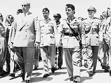 As chief of staff, Abu Nuwar embraced many of the pan-Arabist and anti-imperialist ideas of Nasser, who became president of Egypt in 1956.[26] Abu Nuwar communicated his support for Nasser and the Arab nationalist Ba'ath Party, which was active in Syria and Jordan, during a meeting with Lebanese president and Nasser opponent, Camille Chamoun, in 1956.[27] An American embassy official in Jordan remarked that during a discussion with Abu Nuwar, the latter "out-Nassered Nasser".[23] He was regarded as an "ultranationalist" by the Central Intelligence Agency (CIA).[23] According to historian Ivan Pearson, American diplomatic and intelligence views were colored by the negative perceptions of Abu Nuwar in Israel and Abu Nuwar's role in the dismissal of Prime Minister Samir al-Rifai in May; Rifai was seen by the Israelis as a counterbalance to Hussein's Arab nationalist advisers, and Abu Nuwar maneuvered to sideline Rifai soon after Glubb's dismissal.[23] Abu Nuwar was a major opponent of Iraq's Hashemite rulers (relatives of Hussein) and that country's pro-British prime minister, Nuri al-Said.[23] Abu Nuwar's opposition was driven by suspicions that the Iraqis sought to oust him from his military post, while Iraqi regent Abd al-Ilah and prime minister al-Said regarded Abu Nuwar with suspicion. Abu Nuwar's influence with Hussein was likely a major reason Jordan resisted Iraqi attempts to merge the two Hashemite-ruled countries.[23]
