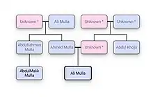 This specifically shows the muezzins in Ali Mullah's lineage. Unfortunately, Sadiq Mullah (his uncle), Abdul Latif Mullah (his cousin) and Atef Mullah (his son) are not shown but were also muezzins; only Atef and his father are alive and are giving the adhan in Masjid-al-Haraam.
