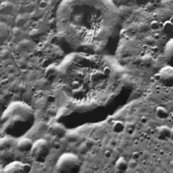Ali Baba is a large crater in the northern hemisphere of Saturn's moon Enceladus. Ali Baba was first discovered in Voyager 2 images. It is located at 55.1° North Latitude, 22.3° West Longitude and is 39.2 kilometers across.[1] It is located near the craters Aladdin and Samad.[2] Ali Baba has a large dome in its interior, suggesting the crater has undergone viscous relaxation. The top of the dome even reaches higher than the crater rim.