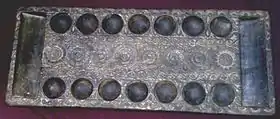 Ali Guli Mane uses two rows of 7 holes each. Each player "owns" the row of holes closest to them. The game starts with 70 pieces (usually tamarind seeds or small shells), with 5, 7 or 12 in each hole.