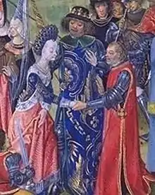 One is a single leaf in French containing copies of eight letters received during the 1390s. These include one from King Richard II, one from John Devereux, 2nd Baron Devereux, whose son John had married her daughter Philippa, two from the younger John written at Calais around 31 October 1396 at the time of the marriage of Richard II to Isabella of Valois, and one from her other son-in-law Robert Lovell.[9][10]