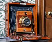 Alice Dryden's Lancaster camera on show in her old bedroom at Canons Ashby House.