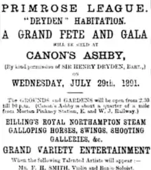 Primrose League "grand fete and gala" at Canons Ashby, advertised in 1891.