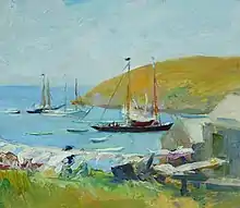 Stoddard visited and lived in Monhegan, Maine, and integrated the people and scenery in her paintings."[3][10] She painted Manville Davis, a fisherman in Mending the Nets and a portrait of artist Andrew Winter.[10] The area became an enclave for artists, some of the other artists who painted and visited there were Robert Henri, the Wyeth family (N. C., Andrew, and Jamie), and Charles Ebert.[11]