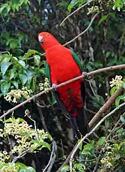 The three species are forest-dwelling, and are found singly, in pairs, or in groups.[2] Australian king parrots sometimes gather in groups of 30 or more around food sources, while Moluccan king parrots sometimes form groups up to 10, and the Moluccan king parrots may gather in groups of five or six.[2] They generally feed on seeds, fruits, and berries in trees.