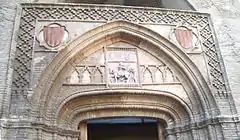 In the spandrels, two quadrilobed medallions appear that harbor shields with the insignia of king of Aragon. In the resulting tympanum between the arches there is a band of interlocking mixtilineal blind arches, which refer to the series in the Banu Hud palace. This strip is interrupted by a box that houses a newly incorporated relief.