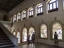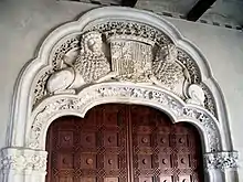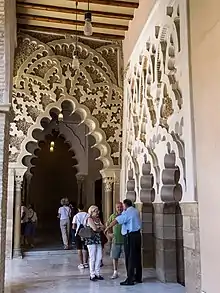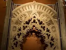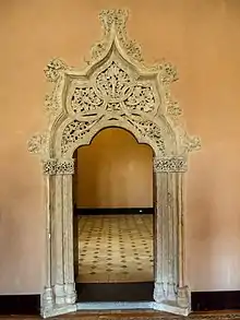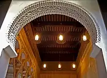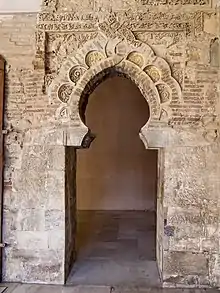 At the eastern end of the entrance portico to the Golden Hall is a small mosque or private oratory that would have been used by the monarch and his courtiers.[6] It is accessed through a portal that ends in a horseshoe arch inspired by the Mosque of Córdoba but with S-shaped springers, a novelty that imitated Almoravid and Nasrid art. This arch rests on two columns with capitals of very geometrical leaves, in the style of Granadan art using mocárabe. Its alfiz is profusely ornamented with vegetal decoration and on it is arranged a frieze of crossing half-point arcs.