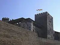 The tower is a defensive structure, with a quadrangular base and five levels which date back to the end of the 9th century, in the reign of the first Banu Tujib, Muhammad Alanqur, who was appointed by Muhammad I of Córdoba, independent Emir of Córdoba. According to Cabañero Subiza, the tower was built in the second half of the 10th century.[3] Its lower part has vestiges of the beginning of the heavy walls of alabaster ashlar bond masonry, and continues upwards with a plank lining of simple plaster and lime concrete, a lighter substance for reaching greater heights. The exterior does not reflect the division of the five internal floors and appears as an enormous prism, broken by narrow embrasures. Access to the interior was through a small, elevated door that was only reachable with a portable ladder. Its initial function was military.