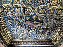 The ceiling of the Throne Room is elaborately decorated. It is 20 metres (66 feet) long 8 metres wide and its Artesonado coffered ceiling is supported by thick beams and sleepers decorated with a lace pattern that forms eight-pointed stars, while generating thirty large, deep square coffers. Inside the coffers are inscribed octagons with a central curly leafed flower that finishes in large hanging pine cones that symbolize fertility and immortality. This ceiling was reflected in the floor, which reproduces the thirty squares with inscribed octagons.