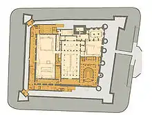The general layout of the palace follows the archetype of desert castles in Syria and Jordan from the first half of the 8th century (such as Qasr al-Hayr al-Sharqi,[5] Msatta, Khirbat al-Mafjar, and, from the early Abbasid era, the al-Ukhaidir Fortress). These castles were square with ultrasemicircular towers and a central tripartite space, creating three rectangular spaces, with the central one having a courtyard with pools and, at the northern and southern ends, the palace living quarters.