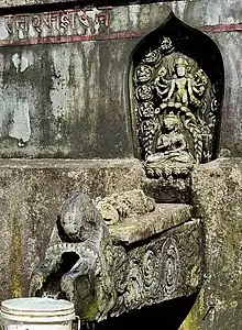 Above the middle of the three makara spouts there is a niche with a sculpture of Buddha Dharma-Chakra. The makara spout on the left has a Lakshmi Narayan sculpture in its niche, with a Buddha statue in front of it. The spout on the right carries a Visnu sculpture (as Vaikuntha Kamalaja) as well as a Buddha.[8]