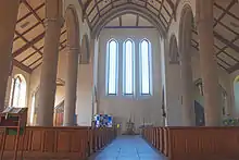 The church's simple layout is of a nave and two flanking aisles, leading to a long aisle-less chancel. However, it starts with a narthex at the base of the tower, containing the baptistery, which is in direct line with the high altar. The simple but noble interior is made bright and airy by vast open spaces, many lancet windows, and plastered walls. The impressive height of the nave (45 ft or 14m) is accentuated by giant drum piers and gothic pointed arches, which hold a coffered wagon roof.[19] The airy, refined interior and coffered roof are later reflected in Dykes Bower's church of The Holy Spirit, Southsea, Hampshire, and in his work on the chancel and transepts at St Edmundsbury Cathedral, including the Cathedral's oriel window, which is foreshadowed by the oriel window at All Saints'. Distinctive to All Saints', the chancel is dominated by an east rose window (see below).[19] Sitting within the church's Gothic setting, the furniture is of a Classical style, including four classical pillars that surround the high altar.[21]