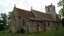 The church is of dressed magnesian limestone with a red tile and Welsh slate roof. The church has a fifteenth century west tower with offset diagonal buttresses, a three light west window and large square sundial, gargoyles to the north and south with a shield beneath the parapet. The south porch is of twelfth century origin. There is a four bay nave of gothic revival style, a two bay chancel and a north vestry.[3] The church has an ornate lychgate on the southern side of its boundaries.