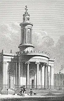 The church was built between 1822 and 1824 and was known as first as the Camden Chapel, then, unofficially, as St Stephen's. It did not receive the dedication of All Saints until 1920.[1] It was designed by the father and son team of William and Henry Inwood who were also responsible for St Pancras New Church. It is a fairly large building of yellow stock brick, with east and west ends faced in Portland stone. The plan is basically rectangular, with an eastern apse mirrored by a semi-circular portico at the west end. Just behind the portico is a cylindrical stone tower surrounded by columns, in imitation of the Choragic Monument of Lysicrates in Athens. The Ionic order is based on fragments brought back from Greece by Henry Inwood and now in the British Museum. The interior has a flat ceiling, with galleries on three sides supported by Ionic columns.[2] The building has generally been praised, but both contemporary writers and later architectural critics such as Sir John Summerson have argued that the tower is too thin in proportion to the body of the church. It is a Grade I listed building.