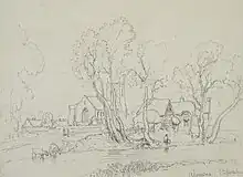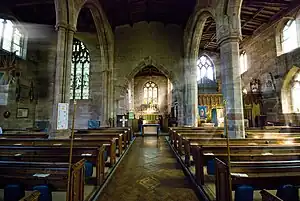 During the 13th century the fine Early English chancel was added to the church complete with lancet windows, and in the south wall a piscina, a sedilia and priest's door. The small window in the north wall had a bell hung by it which was rung at the Consecration of the Sacrament. The present nave and south aisle were built during the 14th century and the original Norman doorway in the north wall was retained. Other features of the 14th century include the 'horse shoe' arch separating nave from chancel and also the majestic tower, the old Norman west door being re-set at its base.[1]