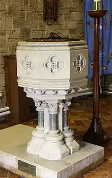 Interior fittings include a stone and marble-columned font of octagonal design, a stone and timber-panelled carved pulpit, oak choir stalls and Communion rails, timber confessional, a J. W. Walker and Sons organ and a stone, wood and marble reredos with carvings and mosaic work.[12] Cecil Martyn, for whom the church was built as a memorial, is commemorated by a brass tablet on the north side.[12]