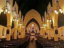 In 1853, the vestry of All Saints' Parish appointed a building committee to oversee the construction of a third, larger church. After corresponding with the firm of Richard Upjohn and Company of New York, plans for the new Gothic Revival-styled church were procured and the cornerstone was laid in 1855. The form of the new church incorporated a long nave with side aisles leading to a recessed chancel. A tall bell tower and spire was centered on the front facade, becoming a part of Frederick's famed "Clustered Spires." The construction was completed in 1856 and this church has been in continuous use by the parish since then.[10] The 1814 building, which sits perpendicular to the third building, was converted for use as a parish hall.
