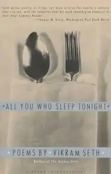 All You Who Sleep Tonight, ISBN 978-0394585161, is a 1990 collection of poems by Vikram Seth.