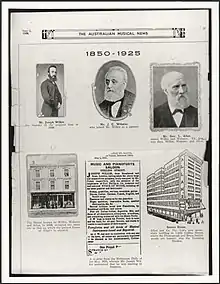 Allans was established in May, 1850 when Joseph Wilkie and John Campbell Webster started a music warehouse (Wilkie and Webster) in Collins Street, Melbourne. George Leavis Allan[1] joined the company in 1862, then twelve years after becoming a junior partner Allan found himself sole proprietor. (The original store[2] had signage "Wilkie, Webster & Allan".) His son George became a partner in 1881 when the name of the firm was formally altered to Allan & Co. By 1877 it was the largest musical warehouse south of the equator, a distinction it retained; in spite of many changes in musical retailing, the firm of Allan built its name into the record of Australian music.[1] The company subsequently became Allans Music Australia Ltd.