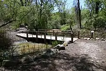 The Alley Pond Environmental Center (APEC), founded in 1972, moved to its own building on Northern Boulevard four years later.[31] The city also acquired over $10.9 million worth of land for the park.[1] An 1870s-era windmill 1 mile (1.6 km) away at Arleigh Road, on the Douglaston peninsula, was relocated to the park when the windmill's original site was threatened with development, and was intended to be used as an APEC exhibit;[32] however, the windmill was burned in an arson two years later.[33] APEC volunteers raised money to build a 40-foot (12 m) replica, which was completed in 2005.[15][34] On the other side of the park, Gertrude Waldeyer led an advocacy group to preserve Oakland Lake, leading NYC Parks to spend $1 million restoring the lake in 1987, with the New York State Department of Environmental Conservation designating the surrounding area as freshwater wetlands the next year.[6][35] In 1993, almost $1 million was spent to restore the Picnic Grove, renovate two stone buildings, and reconstruct the playground and soccer field.[1] By the mid-1990s, development around Alley Pond Park had led to pollution, including in Oakland Lake in the western section of the park.[36] This led local groups to propose that the city hire an administrator to run numerous parks in eastern Queens, including Alley Pond Park, Crocheron Park, Cunningham Park, Douglaston Park, Fort Totten, and Udalls Cove.[37]