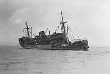 Twenty merchant ships were lost in Axis naval activity in Australian waters in 1942.[49] In an air raid on Port Moresby on 17 June 1942, the 12,920-cubic-metre (4,561 grt) MV Macdhui was hit and set ablaze; three crewmen and a member of the Army working party were killed. A second air raid the following day scored more direct hits on the ship, which burned fiercely, and was a total loss.[52][53] Five more members of the crew were killed and one fatally injured. Another 63 men were injured in the attack, including the master, Captain James Campbell.[54] Two ships were attacked by Japanese submarines in the Gulf of Papua. The Ro-33 sank the 850-cubic-metre (300 grt) MV Mamutu by gunfire on 6 August 1942, and machine gunned survivors in the water. Of Mamutu's 142 passengers and crew, 114 were lost.[55] Ro-33 struck again on 29 August, torpedoing the 9,400-cubic-metre (3,310 grt) MV Malaita, which was returning to Cairns after delivering troops and supplies to Port Moresby. Although listing ten degrees to starboard, Malaita remained afloat, and was taken in tow by MV Matafele and HMAS Potrero. Their escort, the destroyer HMAS Arunta, picked up an ASDIC contact on the Ro-33, and delivered a series of depth charge attacks and sank it.[56]