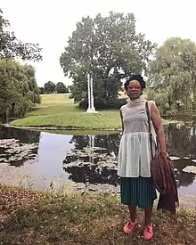 ![]() Hamilton in front of her installation, "The peo-ple cried mer-cy in the storm," at Storm King Art Center in 2018 | |
