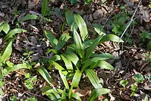 Allium tricoccum (commonly known as ramp, ramps, ramson, wild leek, wood leek, or wild garlic)[2][3] is a bulbous perennial flowering plant in the amaryllis family Amaryllidaceae. It is a North American species of wild onion or garlic widespread across eastern Canada and the eastern United States.[1] Many of the common English names for this plant are also used for other Allium species, particularly the similar Allium ursinum, which is native to Europe and Asia. An edible plant, Allium tricoccum is used in a variety of North American and indigenous cuisines, and has also been used by Native Americans in traditional medicine. A French rendering (chicagou) of the Native American name for this plant is the namesake of the American city of Chicago.