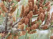 Allocasuarina humilis is an erect or spreading, dioecious or monoecious shrub that typically grows to a height of 0.2–2 m (7.9 in – 6 ft 6.7 in). Its needle-like branchlets are more or less erect, up to 120 mm (4.7 in) long, the leaves reduced to scale-like teeth 0.4–0.5 mm (0.016–0.020 in) long, arranged in whorls of five to seven around the branchlets. The branchlets are smooth and sometimes waxy. The sections of branchlet between the leaf whorls (the "articles") are mostly 3–6 mm (0.12–0.24 in) long and 0.8–1.2 mm (0.031–0.047 in) wide. Male flowers are arranged in spikes 6–18 mm (0.24–0.71 in) long, in whorls of 12 to 16 per centimetre (per 0.39 in.), the anthers 0.7–0.8 mm (0.028–0.031 in) long. Flowering occurs from May to November, and the mature cones are sessile, 12–22 mm (0.47–0.87 in) long and 10–17 mm (0.39–0.67 in) in diameter containing samaras 5–6 mm (0.20–0.24 in) long with a short wing.[2][3][4]