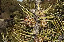 This sheoak was first formally described in 1943 by Charles Gardner who gave it the name Casuarina pinaster in the Journal of the Royal Society of Western Australia from specimens collected near Nyabing by William Blackall.[4][5] It was reclassified in 1982 as Allocasuarina pinaster by Lawrie Johnson in the Journal of the Adelaide Botanic Gardens.[6] The specific epithet (pinaster) means "imitation pine".[7] Specimens of compass bush consistently lean in a southerly direction at an angle of 30°- 40° from vertical.[3]
