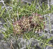 Allocasuarina thuyoides is a monoecious or dioecious, intricately-branched shrub that typically grows to a height of 0.3–2 m (1 ft 0 in – 6 ft 7 in). Its branchlets are up to 30 mm (1.2 in) long, the leaves reduced to erect, scale-like teeth 0.4–0.5 mm (0.016–0.020 in) long, arranged in whorls of five or six around the needle-like branchlets. The sections of branchlet between the leaf whorls are mostly 1–3 mm (0.039–0.118 in) long, 0.3–0.5 mm (0.012–0.020 in) wide. Male flowers are arranged in whorls of up to four 1–5 mm (0.039–0.197 in) long on the ends of branchlets, the anthers 0.4–0.6 mm (0.016–0.024 in) long. Female cones are on slender peduncles 2–7 mm (0.079–0.276 in) long, the mature cones shortly cylindrical to spherical, 8–20 mm (0.31–0.79 in) long and 8–15 mm (0.31–0.59 in) in diameter containing winged seeds 5.0–6.0 mm (0.20–0.24 in) long.[2][3]