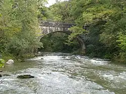 The Allondon (French pronunciation: [alɔ̃dɔ̃]) is a river in France (Auvergne-Rhône-Alpes region) and Switzerland (canton of Geneva). It is 17.9 km (11.1 mi) long,[1] of which 6.1 km in Switzerland and 2.5 km on the French–Swiss border.[2] Its source is located at 649 m (2,129 ft) elevation in the commune of Échenevex in the Ain department in eastern France. It flows into the Rhône at the village of Russin in the canton of Geneva in Switzerland. Its catchment area is 148 km2 (57 sq mi), of which 137 km2 in France.[2] It is home to the only recently known population of the rare insect Lachesilla rossica.