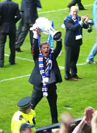 McCoist returned to Rangers as an assistant manager to Walter Smith in January 2007.[41] After Rangers' victory over Queen of the South in the 2008 Scottish Cup final, Smith revealed that McCoist had been in charge of the team for the entire cup campaign.[42] "Obviously, Walter had me in mind for the manager's position when he stepped down, and for a couple of the Scottish Cup runs he let me take the team. I'd do the preparation and the training, but obviously he'd be there. I'd do the team talk, all that kind of stuff."[7]