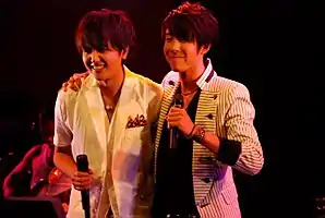 Part of the Japanese diaspora in Peru, Erik Fukusaki traveled to Japan at the age of 18 in order to pursue a career in enka. A Japanese native, Munehiko Ohno was a lifelong practitioner of the buyō style of traditional Japanese dance. Citing music duo Chemistry, he took an interest in music at the age of 18. He began taking singing lessons while attending university.[1] In order to gain entrance into Up-Front Works, Fukusaki and Ohno separately auditioned for the record company's Forrest Award in February 2011.[2][3][4] Upon their admittance, Up-Front posed the idea of the pair creating a single unit together. Ohno agreed to the proposal the day of his successful audition; after seeking advisement from Alberto Shiroma of the Peruvian ensemble Diamantes and Kazufumi Miyazawa of the Japanese band The Boom, Fukusaki deliberated for two weeks before accepting.[3]