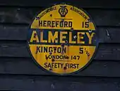 Almeley is in the west of the county, about 18 miles (29 km) northwest of Hereford, 13 miles (21 km) southwest of Leominster and 7 miles (11 km) from the border with Wales.[2] The village is on the Black and White Village Trail.