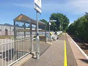 The station consists of one platform on the northern side of the railway, with only a small shelter available. The station also has a small car park, bike racks and a bench.[13] As there are no facilities to purchase tickets, passengers must buy one in advance, or from the guard on the train.